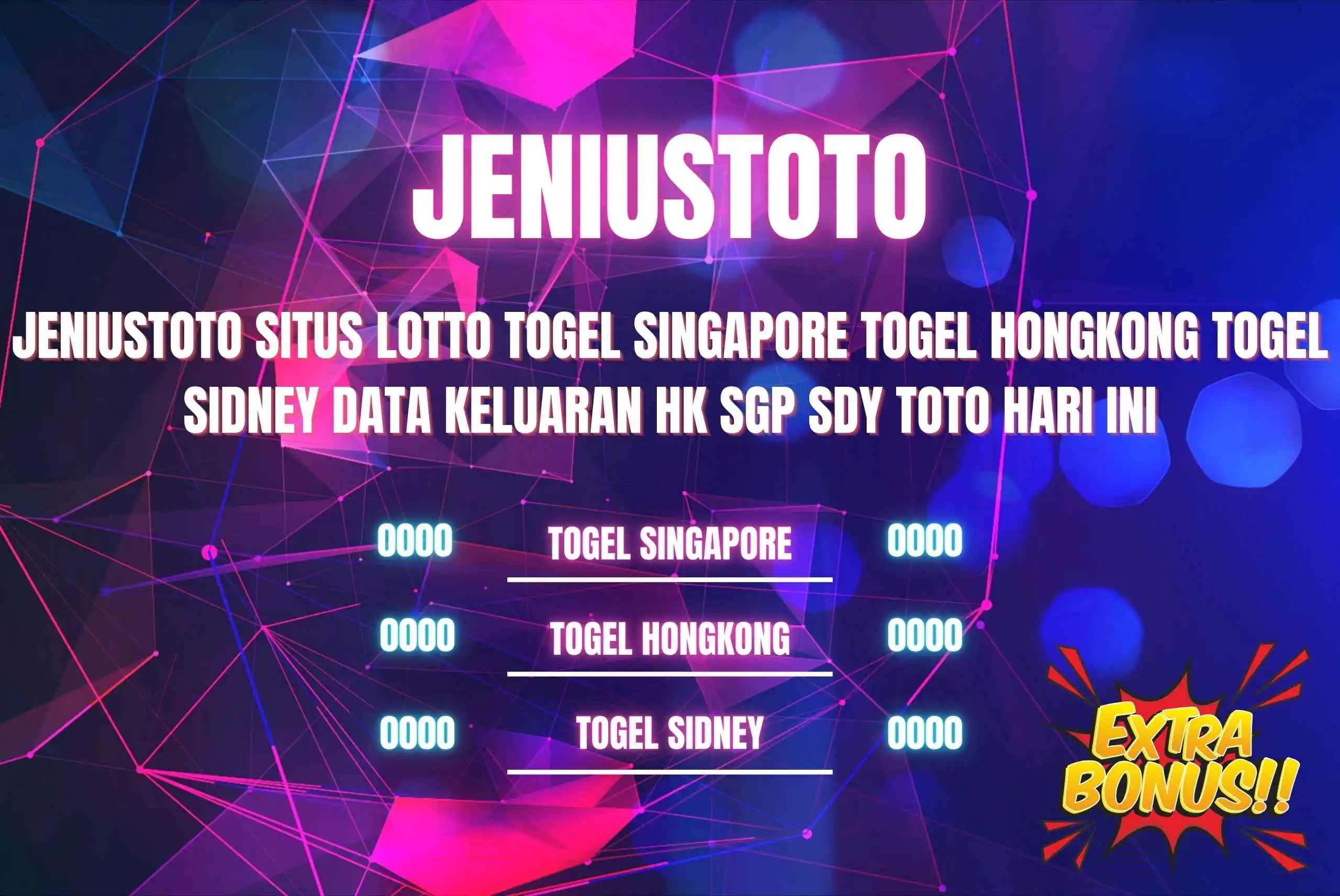 Jeniustoto merupakan bandar situs toto togel online resmi di indonesia dengan pilihan permainan terbaru seperti lotto 4d togel hongkong dan togel singapore juga togel sidney terpercaya di indonesia. Sejak tahun 2024 ini situs togel hk dan togel sgp serta togel sdy memberikan situs toto togel online dengan hasil live draw terbaru. Yakni Lotto 4d, di informasikan ke semua pemain togel hari ini di indonesia dari bandar jeniustoto untuk semua member mencoba ke permainan situs toto togel lotto 4d ini saja. Sebeb dinyatakan oleh semua bandar dan juga pemain togel resmi. Lotto 4d togel singapore, togel hongkong dan togel sydney itu lebih fair untuk memberikan hasil live draw togel resmi. Jadi soba yang memasang angka dapat melihat hasil live draw secarang langsung dari chenel youtube. Pastinya jeniustoto juga memberikan verivikasi resmi untuk memberikan nomor data keluaran hk sgp sdy hari ini dari hasil live draw situs toto togel online di website lotto 4d resmi indonesia. Maka karena itu pemain togel hari ini kami arakan untuk bermain di pasaran togel hongkong singapore sydney dari versi lotto hk sgp sdy 4d terbaru saja. Sebeb di situs toto 4d terbaru ini tersedia nomor dari live draw, pada chenel youtube resmi.